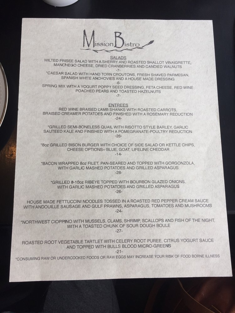Introducing the menu at Mission Bistro, a charming American restaurant located at 225 Main St in Stevensville, MT. This classy yet casual eatery offers a variety of options such as vegan dishes and takes reservations for a seamless dining experience. The reviews from satisfied customers highlight the delicious brunch and upscale dinner setting, with exceptional service and top-notch food. From the mouthwatering Monte Cristo to the delightful French toast with huckleberry syrup, Mission Bistro aims to please your taste buds. The welcoming atmosphere and reasonable prices make it a must-visit spot in Stevensville. Whether you're looking for a cozy brunch spot or a romantic dinner setting, Mission Bistro promises a memorable dining experience that will keep you coming back for more.